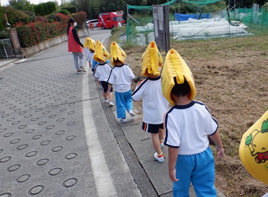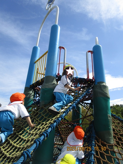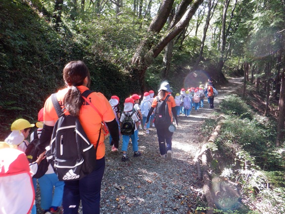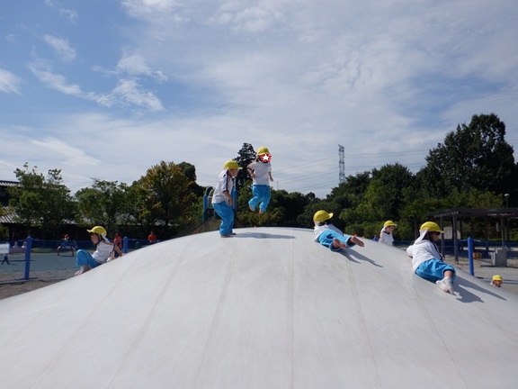 2歳児クラス、年少さん、年中さん、年長さんが観音山ファミリーパークへ行ってきました!年中さん、年長さんは険しい山道を一生懸命歩いて行きました。ファミリーパークではふわふわドームやアスレチックなどで思い切り体を使って遊んだり、段ボールを使って芝滑りをしたりととても楽しそうでした♪どんぐりを見つけた子もいましたよ♪お昼は楽しみにしていたお弁当!!おうちの人が作ってくれたお弁当、美味しかったね!!とっても喜んでいました!!秋の遠足楽しかったね♪