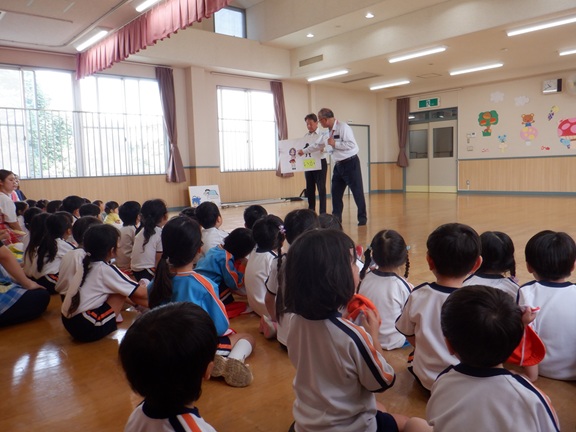 国際警備の方に来て頂き、不審者対応の避難訓練をしました。【いかのおすし】について分かりやすく教えて頂き、子どもたちもしっかりと覚えることができたと思います。職員もさすまた対応の仕方を教えて頂きました。今回学んだことをしっかりと頭に入れ、何かあった時にすぐに対応できるようにしたいと思います。