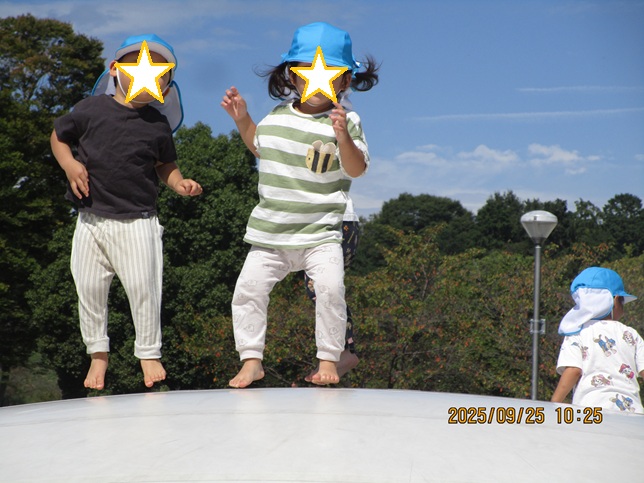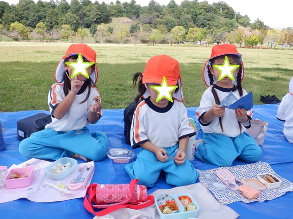 2歳児クラス、年少さん、年中さん、年長さんが観音山ファミリーパークへ行ってきました!年中さん、年長さんは険しい山道を一生懸命歩いて行きました。ファミリーパークではふわふわドームやアスレチックなどで思い切り体を使って遊んだり、段ボールを使って芝滑りをしたりととても楽しそうでした♪どんぐりを見つけた子もいましたよ♪お昼は楽しみにしていたお弁当!!おうちの人が作ってくれたお弁当、美味しかったね!!とっても喜んでいました!!秋の遠足楽しかったね♪
