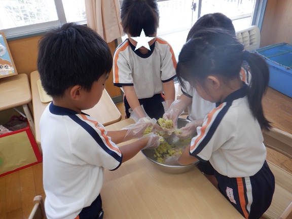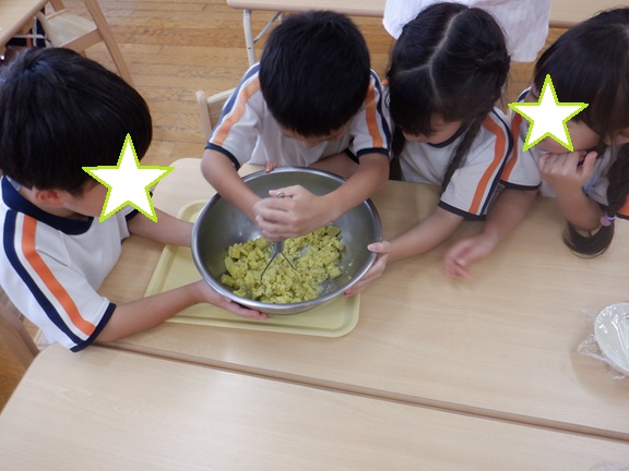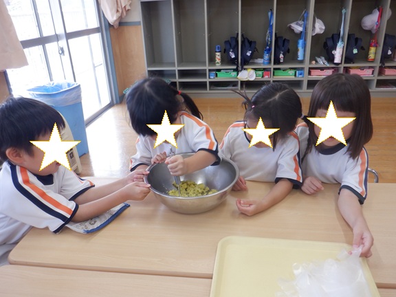 年少・年中・年長組が食育でスイートポテトを作りました。蒸かしたさつまいもにシロップを混ぜ、マッシャーでつぶして手でこねこね♪丸めたり、ハートや四角など好きな形にしたりととても楽しそうに作っていましたよ!!ミールケアの方に焼いて頂き、給食の時に食べました!!自分の作ったスイートポテト美味しかったね♪