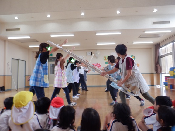 7月22日(火)になつまつりをしました!お遊戯室に集まって盆踊りを踊ったり年長さんは自分たちで作ったおみこしを担いだりしました!「わっしょい!」と大きな掛け声で担ぐ姿、とってもかっこよかったです。その後は各クラスうちわづくりをし、素敵なうちわが完成しましたよ!!ひもくじとヨーヨー釣りのお店を年長さんがお店屋さんになりきってお手伝いをしてくれ、他のクラスのお友達はお店に行き、おもちゃやヨーヨーをゲット!!お祭りの雰囲気を味わい、楽しく過ごせました!お祭り楽しかったね♪